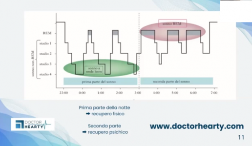 Fisiologicamente nella prima metà della nostra notte di riposo hanno prevalenza le fasi di sonno profondo per la “riparazione del corpo” e nella seconda quelle di sonno REM/ fase dei sogni di ”neuroriparazione” come evidenzia l’esperienza comune di tutti noi del ricordo di aver sognato in prossimità del risveglio mattutino.